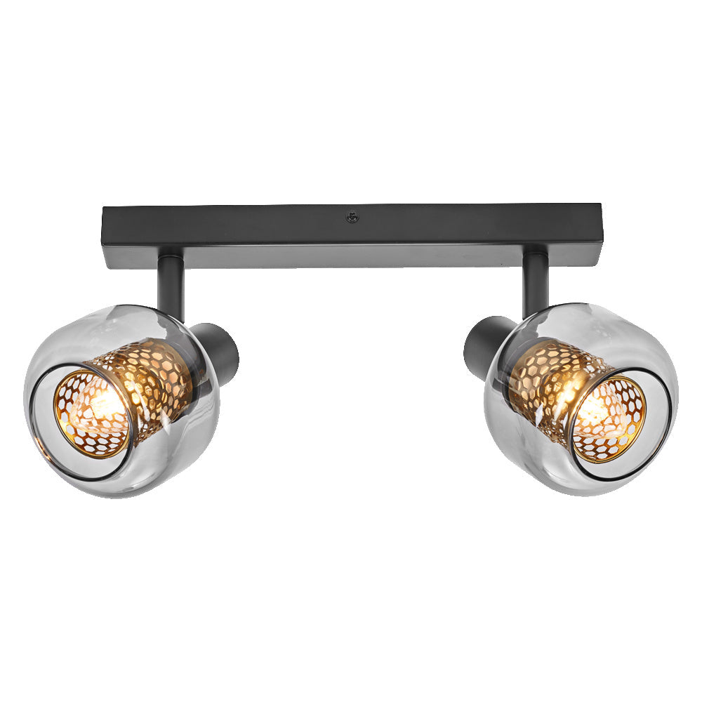 Deckenanbau-Leuchten aus goldenem Wabengitter und rauchigem Glas mit E14 Fassung.