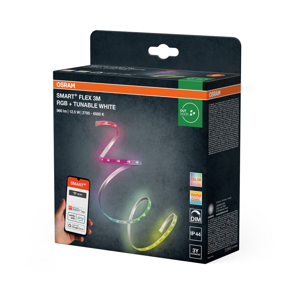 Dekorative LED-Streifen für den Außenbereich mit WiFi-Technologie. Produkteigenschaften: Dimmbar. RGB-Farbsteuerung, ca. 16 Mio. Farbmöglichkeiten einstellbar. Farbtemperatur über Tunable White einstellbar: 2.700…6.500 K. Steuerbar über SMART+ App (mit mindestens Android™️™? 4.4 oder iOS 14.0). Flexible, biegsame LED-Lichtstreifen. Schutzart: IP44. Produktvorteile: Einfache und schnelle Installation. Verwendet mehrfarbiges und kaltes oder warmweißes Licht für maximal flexible Lichtszenen. Anwendungsgebiete: Anwendungen im Außenbereich. Indirekte Beleuchtung. Technische Ausstattung: Steuerung über App oder Sprachsteuerung erfordert kompatibles Smart-Home-System. Für Steuerung über SMART+ App-Smartphone (ab Android™️ 6.0 oder ab iOS 14) erforderlich. Vollständiges Montage- und Anschlusszubehör enthalten.