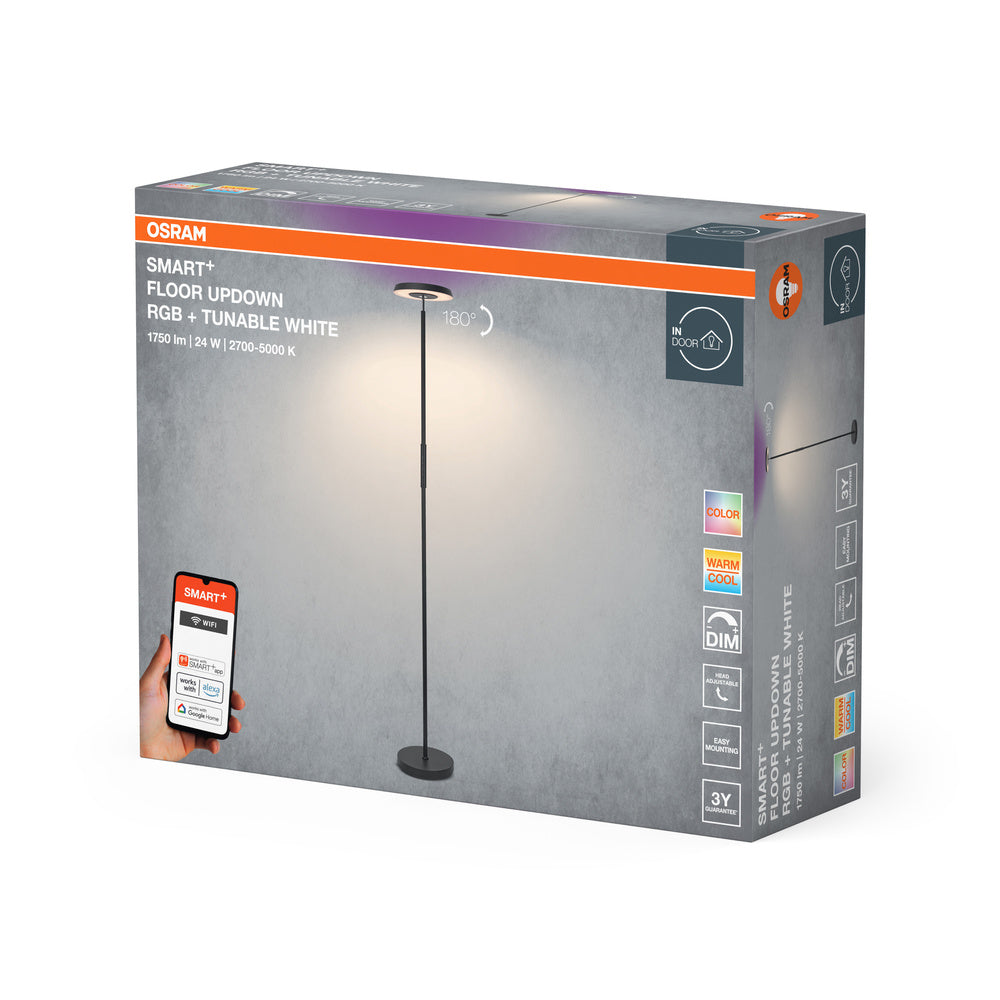 Dekorative Stehleuchte mit Wifi-Technologie und RGB- und CCT-Wechsel. Produkteigenschaften: Dimmbar. RGB-Farbsteuerung, ca. 16 Mio. Farbmöglichkeiten einstellbar. Steuerbar über SMART+ App (mit mindestens Android™️™? 4.4 oder iOS 14.0). Indirekte Beleuchtung. Farbtemperatur- und RGB-Steuerung über Schalter am Produkt. Netzwerkprotokoll: WiFi. Produktvorteile: Einfache und schnelle Installation. Verwendet mehrfarbiges und kaltes oder warmweißes Licht für maximal flexible Lichtszenen. Anwendungsgebiete: Wohnräume. Indirekte Beleuchtung. Gaming-Ecken. Home Entertainment-Bereiche. Technische Ausstattung: Vollständiges Montage- und Anschlusszubehör enthalten.