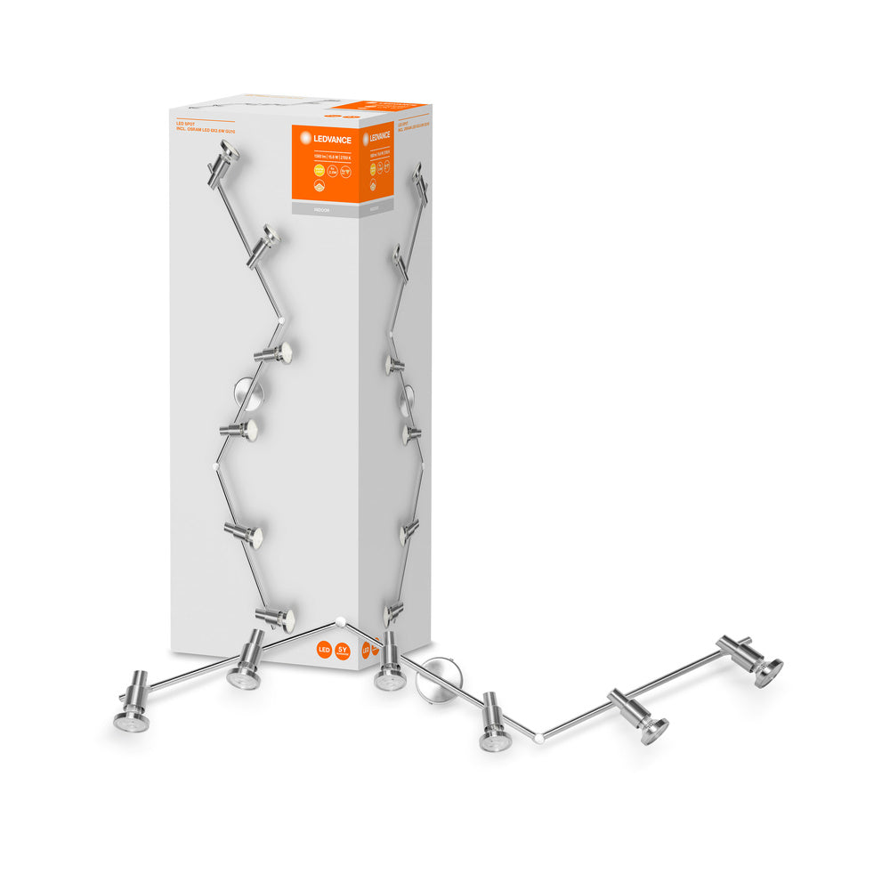 Plafonnier avec spots GU10 flexibles. Caractéristiques du produit. La famille de luminaires comprend cinq variantes avec jusqu'à 6 têtes de lampe spot. Surface du boîtier en nickel brossé. Tête réglableAvantages du produit. Économies d'énergie jusqu'à 90 % par rapport aux spots à lampe halogène. Un design intemporel. Personnalisation polyvalente grâce aux lampes LED remplaçables. Domaines d'application faciles à assembler. Applications intérieures. Couloirs, zones d'entrée, cages d'escalier, pièces à vivre, caves. Cuisines, espaces de travail. Pose au plafond et au mur. Equipement technique. Equipé d'une lampe LED OSRAM EAN 4058075233263. Accessoires complets de montage et de connexion inclus N° d'enregistrement DEEE. DE 30638372