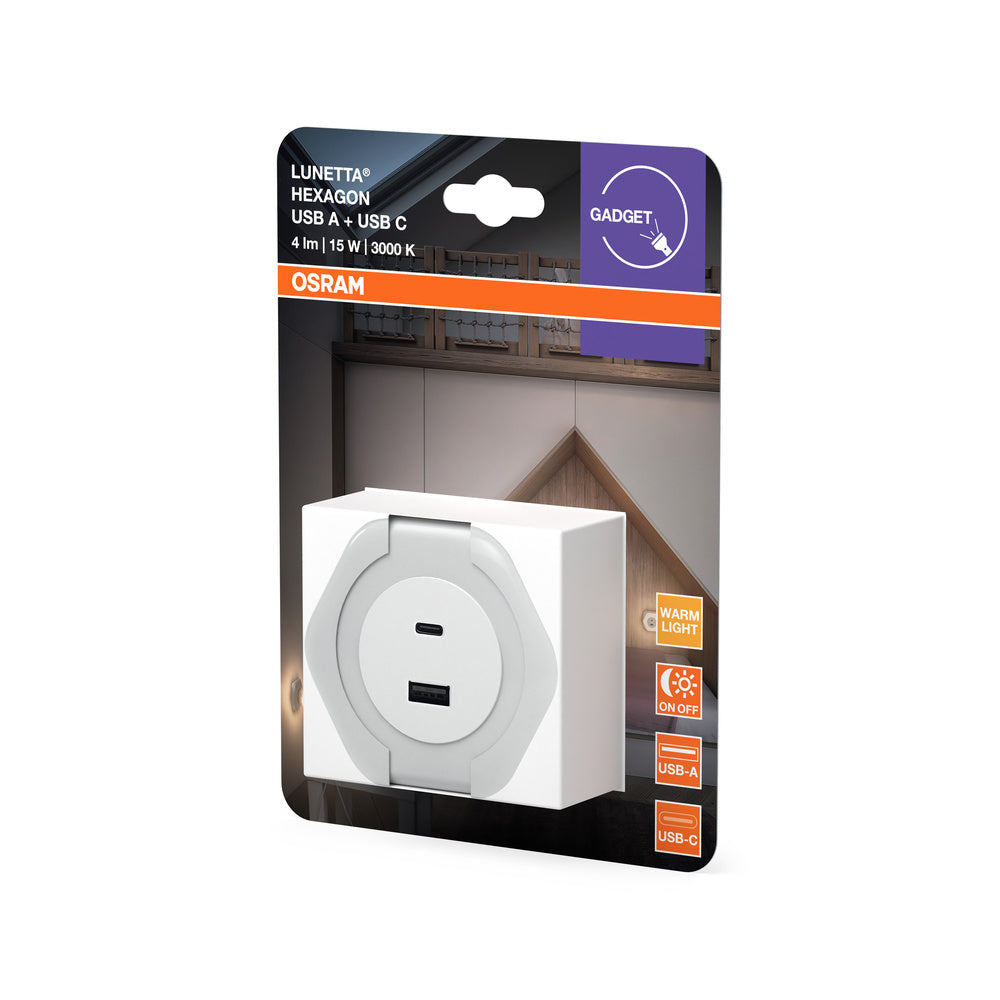 Veilleuse prise avec connexion USB A et C et capteur de lumière du jour. Caractéristiques du produit : connexion USB A et C avec fonction de charge. Couleur de la lumière : blanc chaud. Tension d'alimentation : 220…240 V. Capteur jour/nuit intégré. Avantages du produit : prêt à l'emploi grâce à la prise EU. Économe en énergie grâce à la technologie LED. Design caractéristique et élégant. Domaines d'application : chambre à coucher. Chambre d'enfant. Couloirs, escaliers. Veilleuse. Pour éclairage intérieur uniquement.